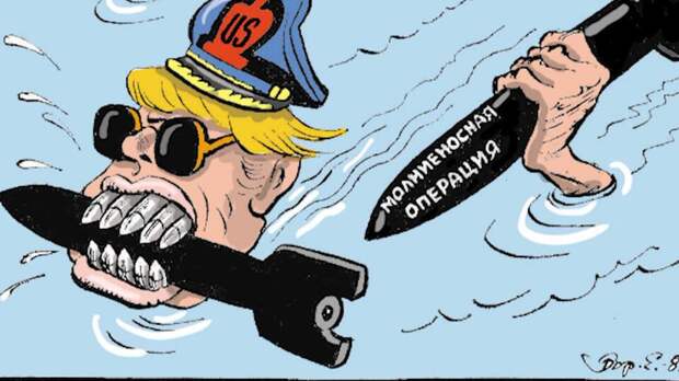 Герой рисунка – человек в очках, с ракетой в зубах и в фуражке с надписью "США", многим напоминает американского лидера Дональда Трампа. Те же черты, тот же силуэт, та же демонстративная решимость. История меняет имена, но, как показал Ефимов, сценарий остается прежним.