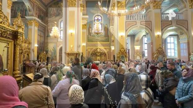 На опубликованных кадрах видно, как люди собрались не только в храме, но и вокруг него. Священники благословили прихожан, держащих в руках ветки вербы.