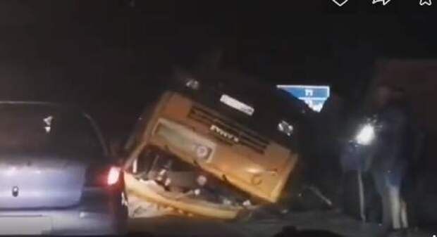 На кадрах видно, что на дороге валяется выбитое лобовое стекло, предположительно от легковой машины.