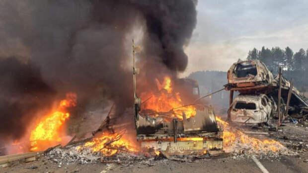 Известно, что страшное ДТП произошло на 1325-м километре федеральной трассы Р-255 "Сибирь". Приехавшие на место пожарные и спасатели обнаружили, что пожар охватил четыре грузовика, включая автовоз, в котором находились семь легковушек.