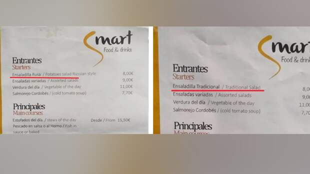 Теперь вместо "Русского" салата в меню значится "Традиционный". Стоимость не изменилась – все те же восемь евро за порцию.