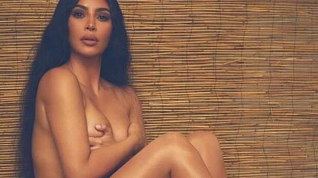 Кардашьян на скандальном снимке позирует с распущенными волосами топлес в телесных колготках собственного бренда Skims.