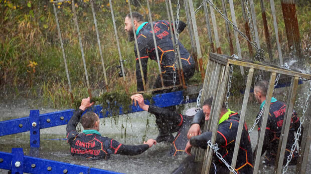 "Очень тяжело проходить. Все скользкое, бревна скользкие, все становится еще опаснее в десять раз, руки не слушаются. На огневом рубеже команду Михаила подвело оружие, и он сейчас употребляет все обороты русского языка", – заявил ведущий проекта "Победители" Сергей Бадюк.