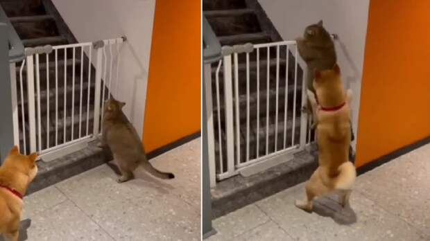 На этих кадрах запечатлено, как он запрыгивает на забор и висит на нем, держась лапами. Однако бдительный сиба-ину тут же подходит и обхватывает хвостатого передними лапами, не давая перемахнуть через ограду. Противостояние длится некоторое время, и в итоге коту приходится вернуться на пол ни с чем.Забавный ролик набрал более 1,4 млн просмотров в Instagram. Интернет-пользователи шутят в комментариях: