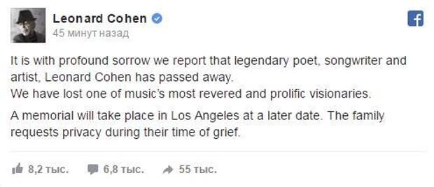 "С глубокой скорбью мы сообщаем, что легендарный поэт, композитор и артист Леонард Коэн ушел от нас. Мы потеряли одного из самых почитаемых и продуктивных мыслителей", – говорится в сообщении.