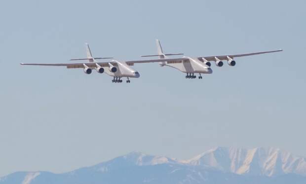 Двухфюзеляжный самолет-носитель Stratolaunch Model 351 пролетел над пустыней Мохаве на юго-западе США.