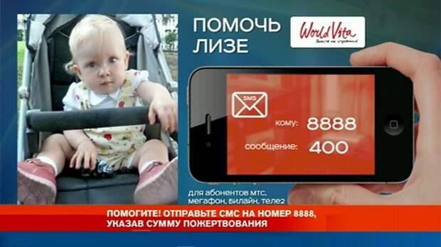 Спасти жизнь маленькой Лизе мы можем все вместе. РЕН ТВ совместно с фондом World Vita начинают сбор средств. Отправьте СМС на короткий номер 8888, а в тексте сообщения просто укажите сумму, которую хотите пожертвовать. Деньги будут списаны со счета вашего мобильного телефона. Любая, даже самая небольшая сумма имеет значение, когда вопрос касается жизни ребенка.