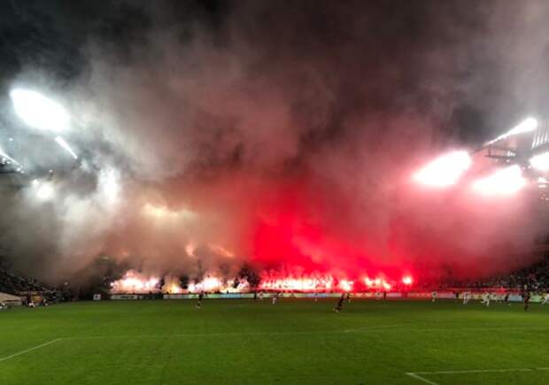Болельщики команд "Легия" и "Гурника" устроили масштабное файер-шоу на трибунах стадиона имени Юзефа Пилсудского.
