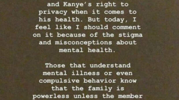 "Как многие из вас знают, у Канье - биполярное расстройство. Каждый, кто с этим сталкивался, понимает, насколько все сложно. Я никогда не обсуждала это публично, учитывая право Канье на приватность, когда дело касается его здоровья. Но сегодня я чувствую, что должна это сделать", - написала она в своем аккаунте.