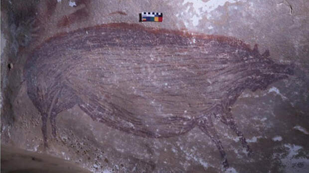 Рисунок размером 136 на 54 обнаружили в пещере на острове Сулавеси. Он выполнен темно-красным пигментом охры.