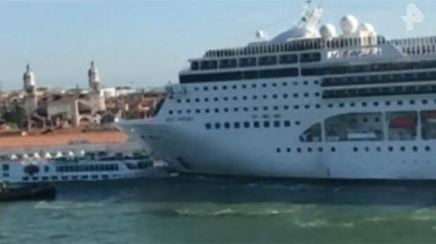 В Венеции для десятков туристов обычная экскурсия едва не закончилась катастрофой. Огромный круизный лайнер просто протаранил крошечное по сравнению с ним прогулочное судно.