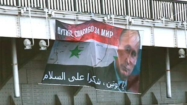 На изображении помещено фото российского лидера на фоне сирийского флага и в обрамлении двух надписей на русском и арабском языках: "Путин, спасибо за мир".
