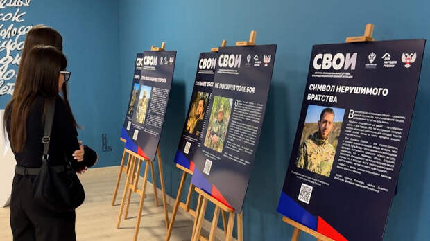 На трех этажах выставка, посвященная проекту "Свои". Там истории взаимовыручки бойцов спецоперации и их предков в годы Великой Отечественной войны.