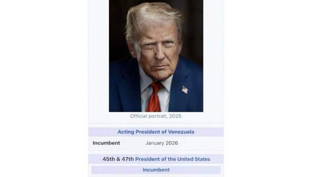 Скриншот имитирует страницу энциклопедии Wikipedia, где перечислены его титулы: 45-й и 47-й президент США, а ниже добавлена строка "Исполняющий обязанности президента Венесуэлы" с датой января 2026 года.