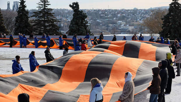 250 активистов развернули в центре Донецка 200-метровую георгиевскую ленту в честь Дня защитника Отечества. Об этом 23 февраля сообщил РЕН ТВ глава местного отделения "Молодой гвардии" Сергей Добровольский.
