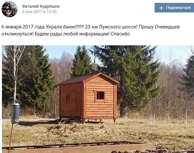 Позже потерпевший написал, что баня нашлась. Однако, где она была и кто ее украл, он не сообщил.