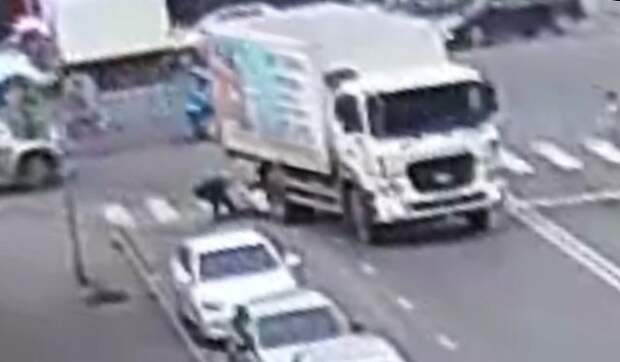 На записи камеры наблюдения запечатлено, как два ребенка без взрослых шли по "зебре". Дети не заметили поворачивающий на дорогу грузовик.