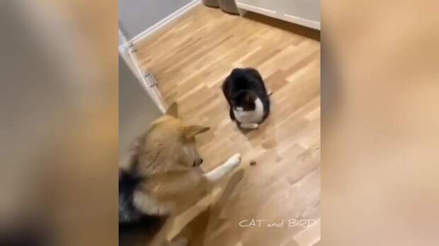На кадрах видно, что собака очень хочет взять вкусняшку, лежащую рядом с пушистым "доном Корлеоне".