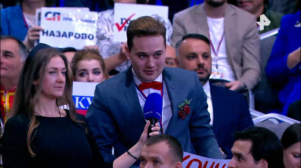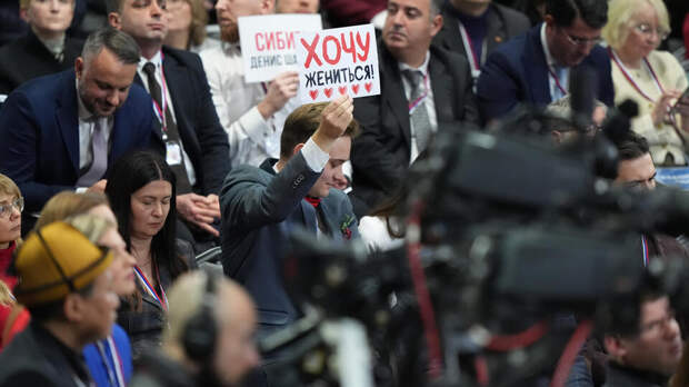 "То, что написано на этом плакате, не просто так. Я знаю, что моя девушка смотрит сейчас прямую линию. Олечка, выходи за меня замуж. Поскольку все это происходит здесь, Владимир Владимирович, будем очень рады видеть вас на свадьбе", – заявил журналист.
