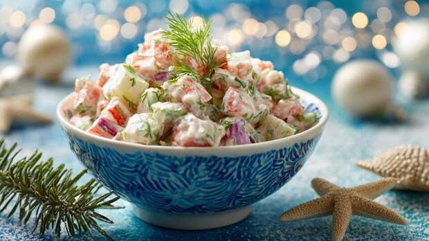 Оливье с кальмарами и крабовыми палочками: легкий морской вариант