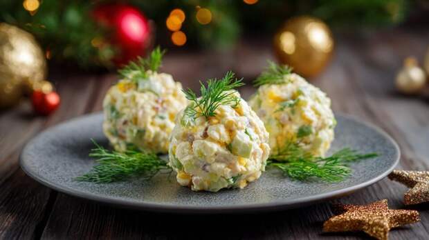 Для более удобной подачи и изысканного вида можно приготовить оливье в виде маленьких закусочных шариков. В этом варианте все привычные ингредиенты смешиваются, после чего из них формируются небольшие шарики, обвалянные в яичных белках и желтках.