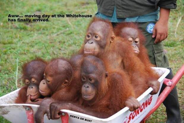 Под снимком, на котором запечатлен примат, стояла надпись: "День переезда в Белом доме".