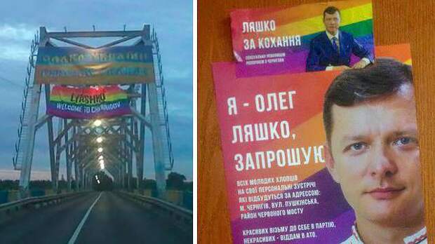 В социальных сетях активно обсуждают гей-флаг украинского депутата Олега Ляшко, который якобы появился на его родине - в Чернигове. Блоггеры публикуют фотографии, на которых изображен огромный баннер с ЛГБТ-символикой и надписью "Lyashko, Welcome to Chernigov".