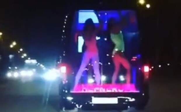 На записи видно, как две девушки, в розовом и салатовом купальниках, танцуют на пилоне в автобусе, задние двери которого прозрачные.