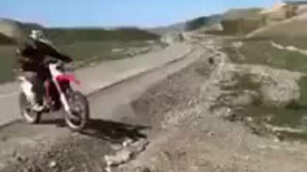 На кадрах видно, как мотоциклист разгоняется и уверенно едет к вершине хребта, но в последний момент земное притяжение берет вверх и транспорт глохнет, а затем срывается вниз и летит вниз, цепляясь за выступы.