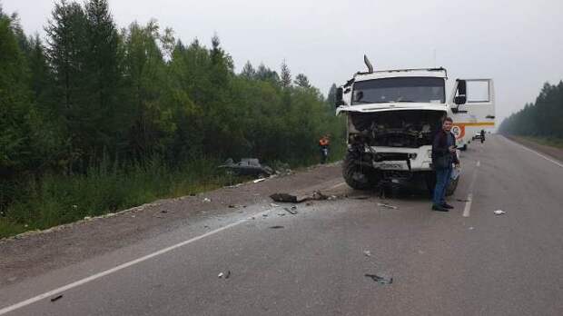 Авария произошла 13 августа на 379-м километре трассы "Лена". КамАЗ столкнулся с легковушкой Toyota Mark II.