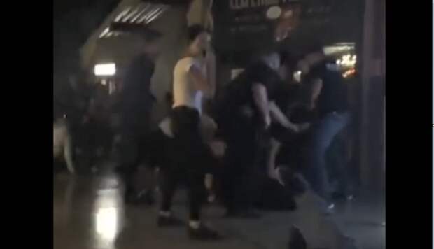 На кадрах видно, что сначала драка завязалась между двумя людьми, но вскоре вмешались остальные.