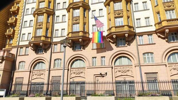 Жители Москвы заметили, что на здании посольства США в Москве появился еще один флаг. Так, кроме американского стяга диппредставительство "украшает" радужный символ ЛГБТ-сообщества.