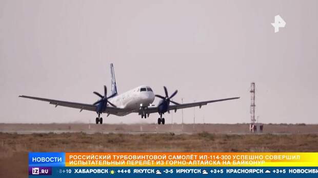 Полностью российский турбовинтовой самолет Ил-114-300 совершил успешный испытательный перелет из Горно-Алтайска на Байконур и обратно. Сейчас машина, все детали которой разработаны и сделаны отечественным конструкторами, находится на финальной стадии сертификации и проходит комплекс летных испытаний.