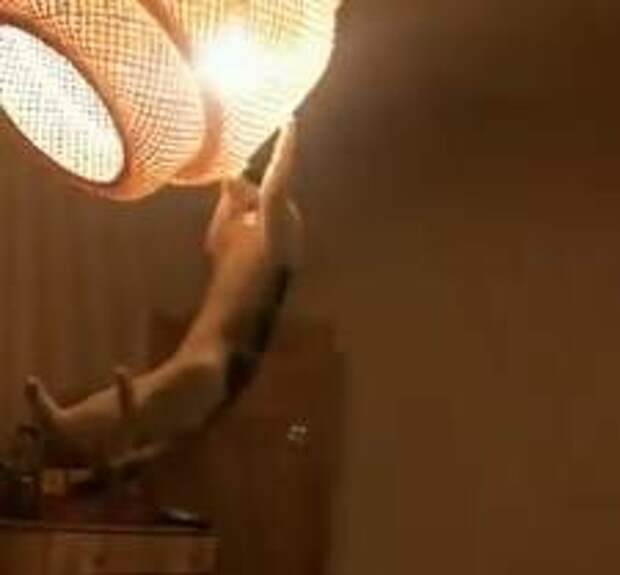 На кадрах видно, как усатый висит у самого потолка на люстре. Интернет-пользователи предположили, что он захотел стать мотыльком, а потому полетел на свет, как насекомое.