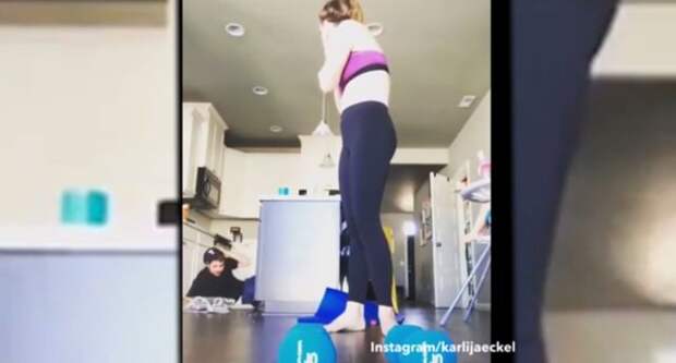 На ролике можно увидеть, как муж, пока жена занимается аэробикой, забирается с ногами на кухонные стол и тумбу.
