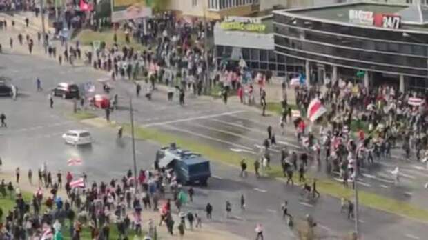 Ранее сообщалось, что протестующие в Минске вывели из строя водомет. Инцидент произошел на пересечении проспекта Машерова и улицы Заславской. Несколько десятков людей обступили водомет, который силовики применили против толпы. Они сняли с него канистры с красящей жидкостью, вылив ее на дорогу. После этого водомет оказался выведен из строя.