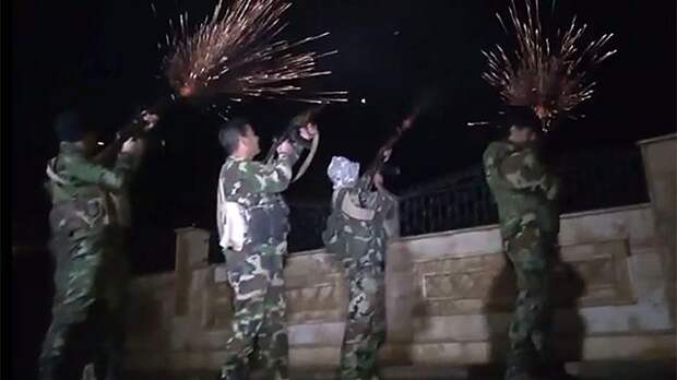 На кадрах видно, как солдаты армии Сирии поднимают вверх руки и громко скандируют победные лозунги.