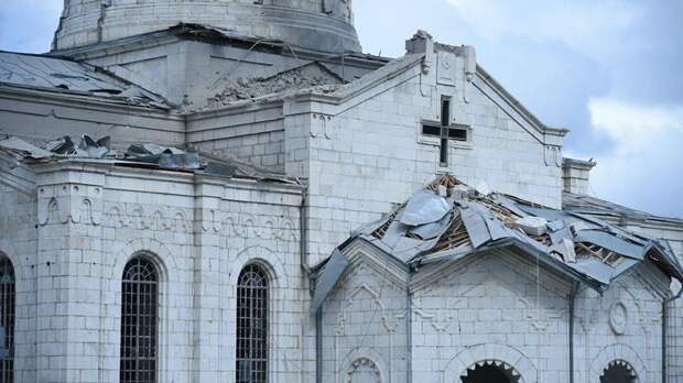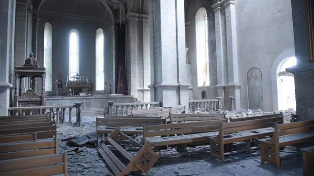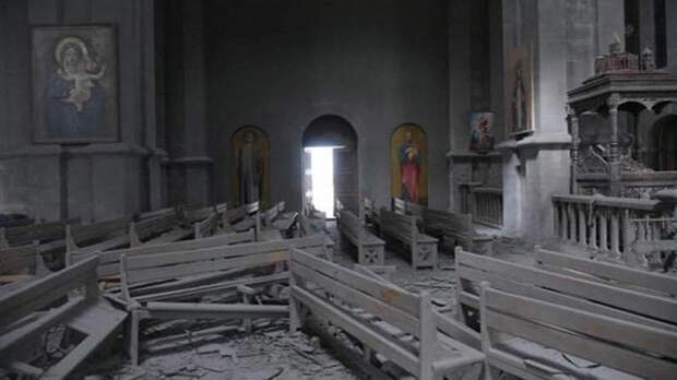 В Сети появились фотографии, на которых запечатлены последствия обстрела собора Святого Христа Всеспасителя Казанчецоц в городе Шуши в Нагорном Карабахе. Снимки опубликовал военный корреспондент Александр Коц в своем Telegram-канале.