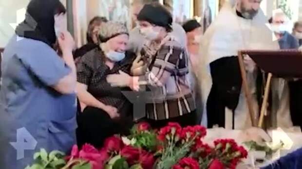Возле церкви дежурили полиция и медики.86-летнюю мать Захарова Марью Ивановну две женщины завели в храм под руки незадолго до начала церемонии прощания. Родственники погибшего отказываются от общения с журналистами и волнуются о состоянии мамы Сергея. Пожилая женщина узнала о смерти сына только в день его похорон.