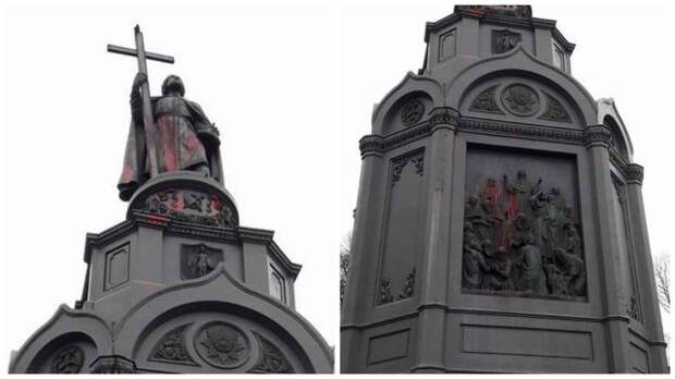 Вандалы облили красной краской памятник Владимиру в Киеве.