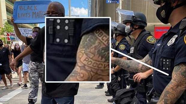 Пользователь социальной сети "ВКонтакте" раскрыл личность американского полицейского с татуировкой "Россия" на руке, который обеспечивал безопасность в штате Техас на одной из акций протеста.