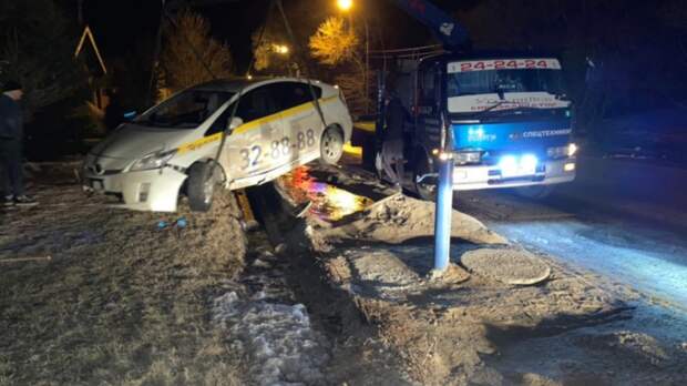 Toyota Prius ехала по улице Лермонтова со стороны Солдатской на скорости. На скользкой дороге таксист не справился с управлением и слетел с проезжей части, после чего врезался в забор, который оказался на пути машины.