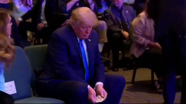 После этого Трамп складывает деньги в урну для пожертвований.