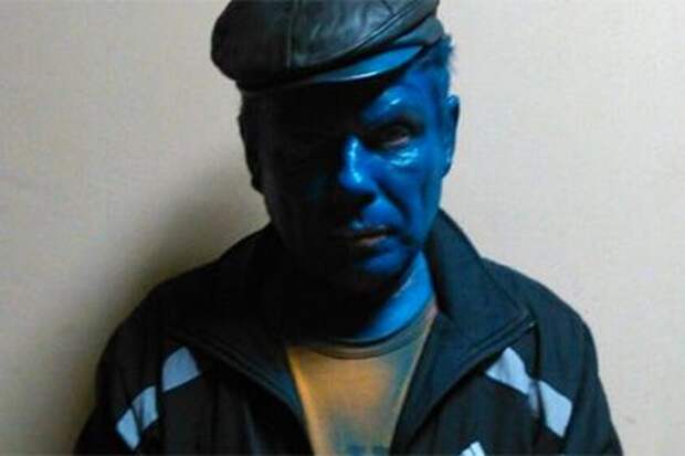 Украинские националисты раскрасили человека в цвета флага Украины: лицо – в синий цвет, одежду – в желтый.