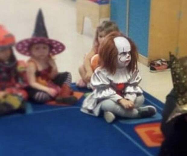 Малыш, сидящий на полу (судя по всему, в детском садике) в образе клоуна из произведения Стивена Кинга "Оно" выглядит действительно устрашающе. При этом ребенок смотрит на кого-то с угрюмым выражением лица, что пугает не меньше, чем его грим.