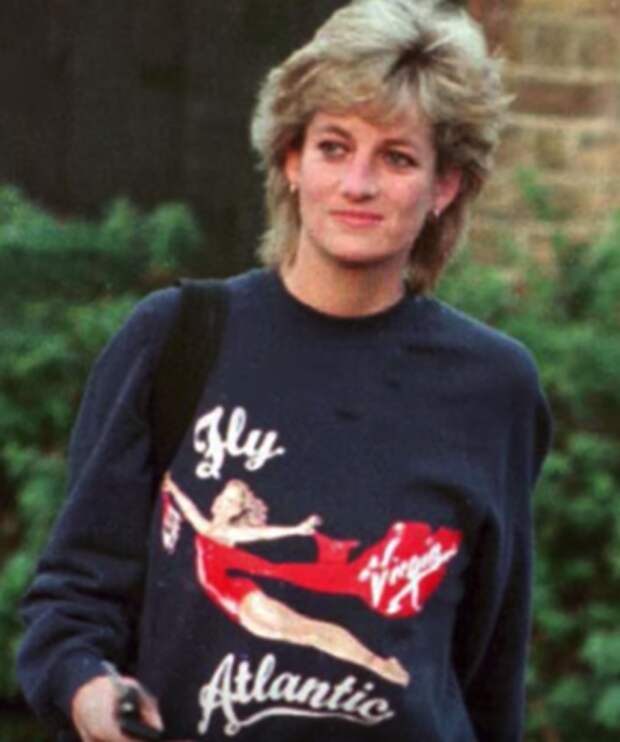 Сообщается, что в темно-синем свитере с принтом в виде парящей в небе девушки принцесса Диана часто занималась спортом.