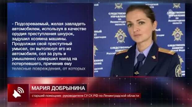 "Подозреваемый, желая завладеть автомобилем, используя в качестве орудия преступления шнурок, задушил хозяина машины. Продолжая свой преступный умысел, он вытолкнул его из автомобиля, сел за руль и умышленно совершил наезд на потерпевшего, причинив ему телесные повреждения, от которых тот скончался на месте", - прокомментировала старший помощник руководителя СУ СК РФ по Ленинградской области Мария Добрынина.