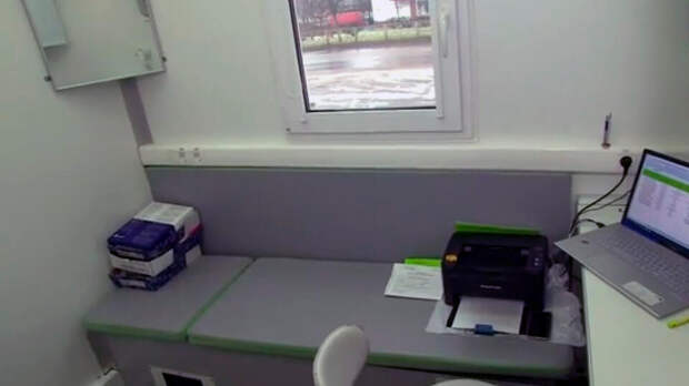 Фельдшер на примере аналогичного мобильного пункта показала, как все было устроено в угнанном автомобиле: три кабинета – для заполнения документов, осмотра и непосредственной вакцинации.