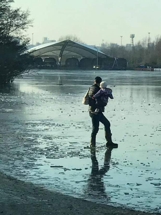 Британская береговая охрана опубликовала фото в "Фейсбуке", на котором мужчина с ребенком на руках идет по тонкому льду. Спасатели обвиняют отца в том, что он подвергает опасности свою жизнь и жизнь малыша.