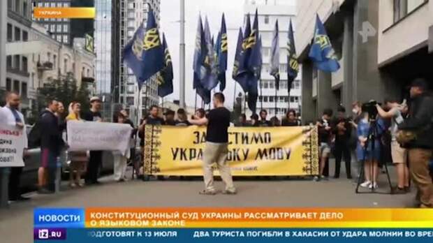 В эти минуты Конституционный суд Украины решает судьбу скандального закона о языке. Согласно ему, статус единственного государственного имеет только украинская мова, остальные фактически вытесняются и запрещаются. А это уже кадры, снятые за пределами здания: там собрались десятки радикалов.
